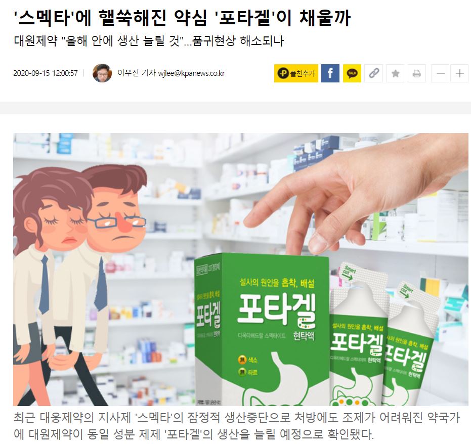 대웅제약 스멕타의 대체약품으로 포타겔 추천